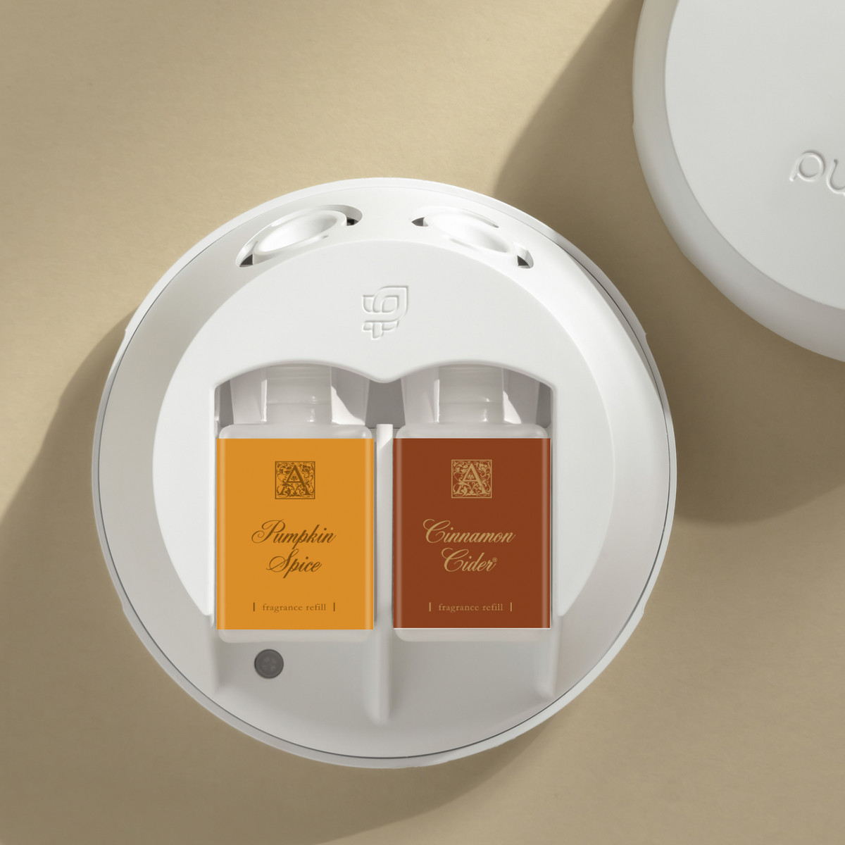 This set includes two premium Aromatique scents, Cinnamon Cider and Pumpkin Spice, and a Pura 4TM smart fragrance diffuser.