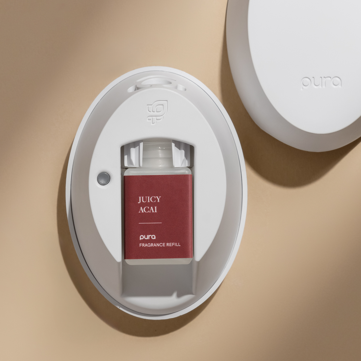 This set includes one Pura Juicy Acai fragrance vial and a Pura Mini™ smart home diffuser.