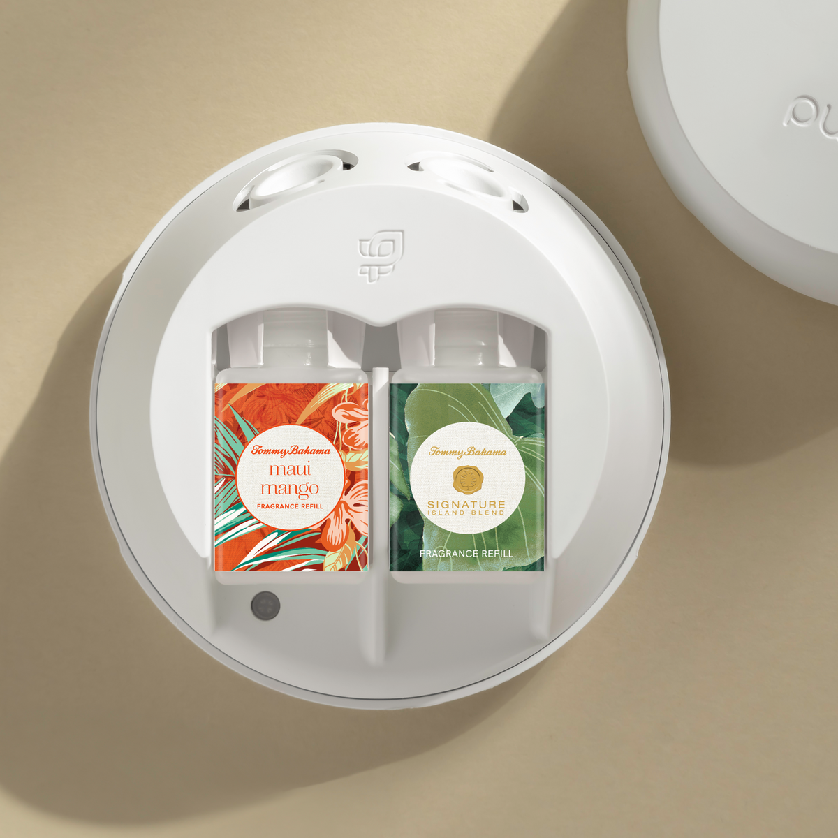 This set includes two premium Tommy Bahama scents, Maui Mango and Signature Island Blend, and a Pura 4™ smart fragrance diffuser.